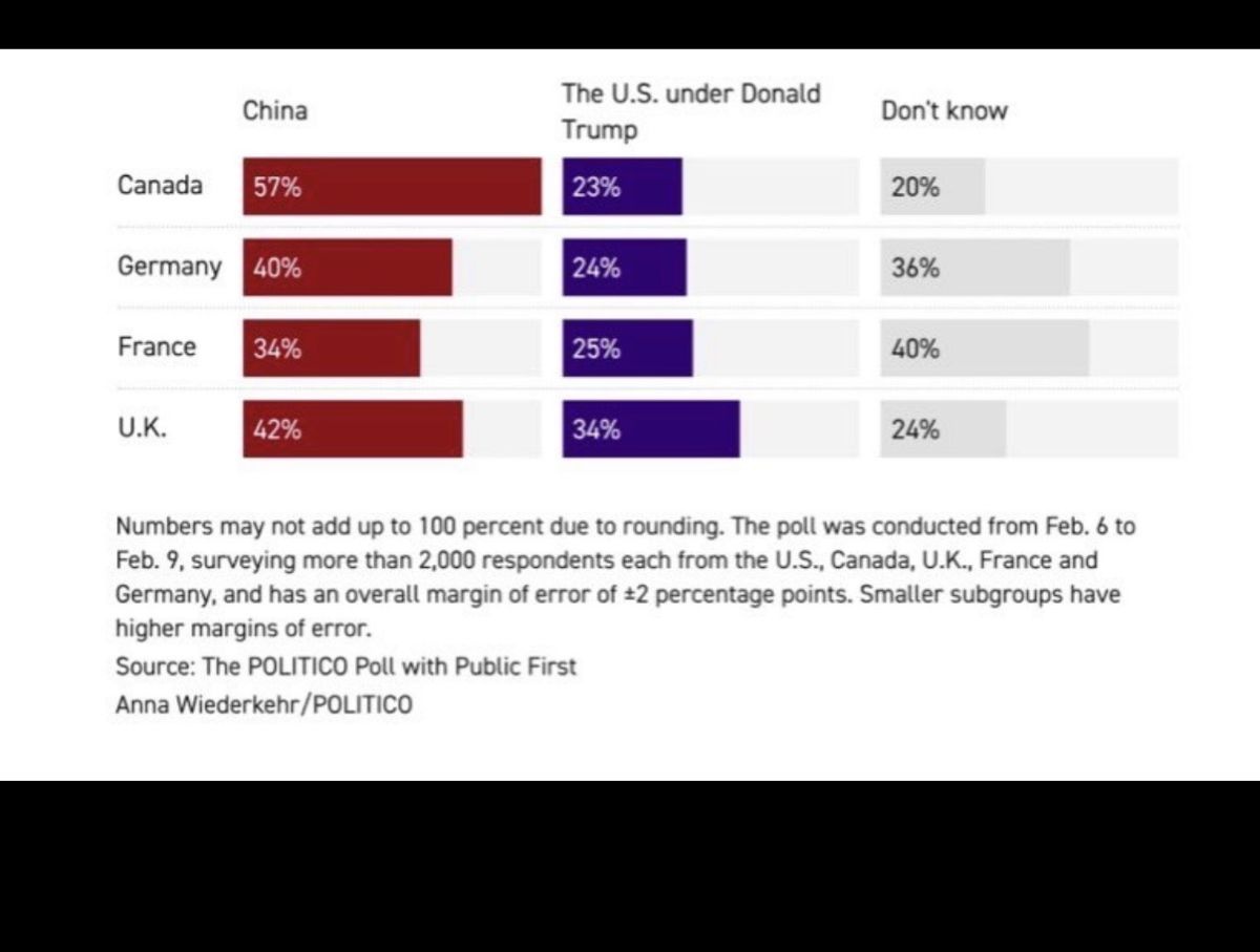 中国とアメリカどちらが信頼のおける国ですか?カナダ 🇨🇳57% 🇺🇸27%