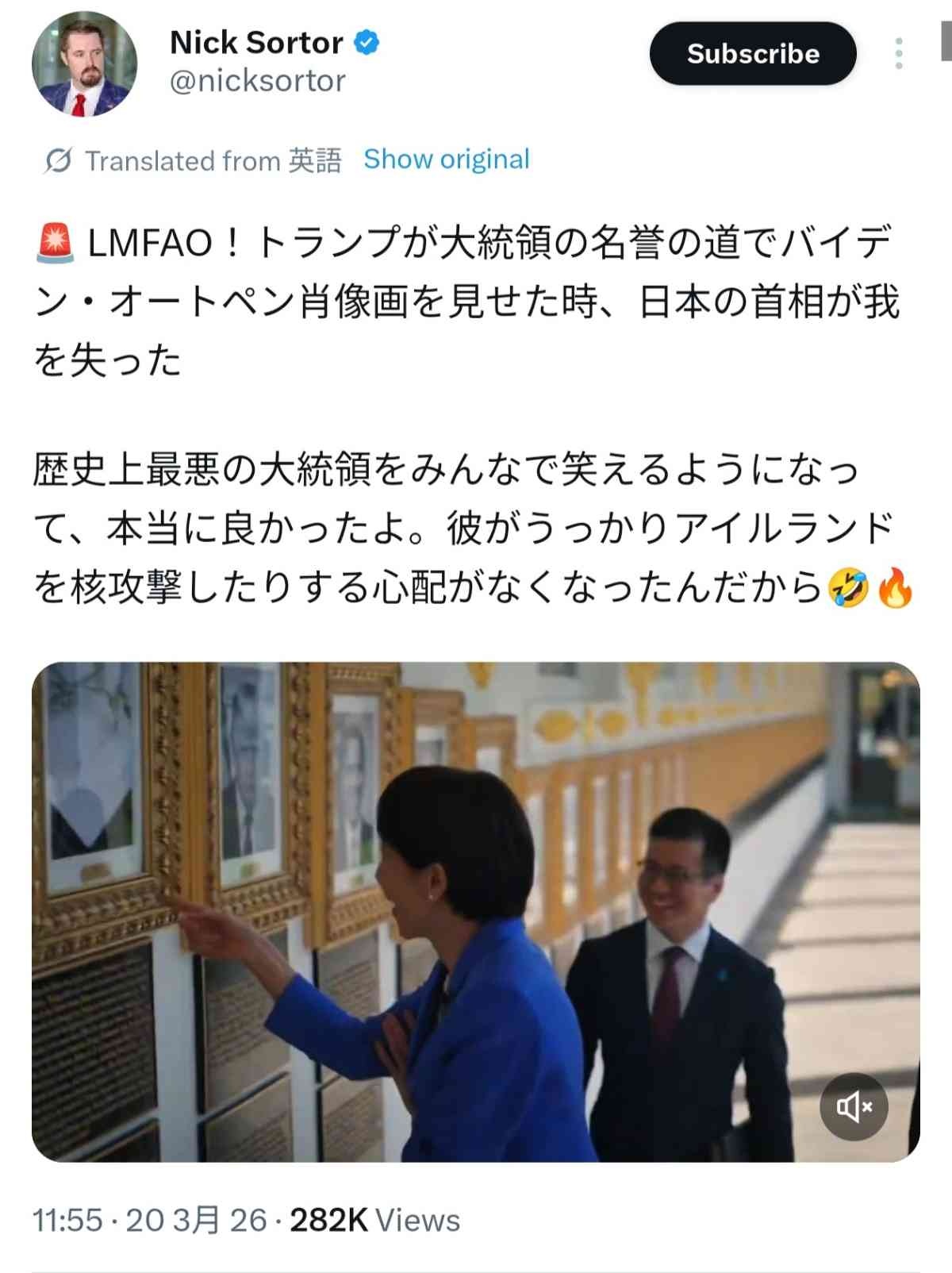 高市首相、バイデン氏の肖像画がオートペンの写真に差し変わってるのを見て大爆笑している映像、世界で大拡散!h