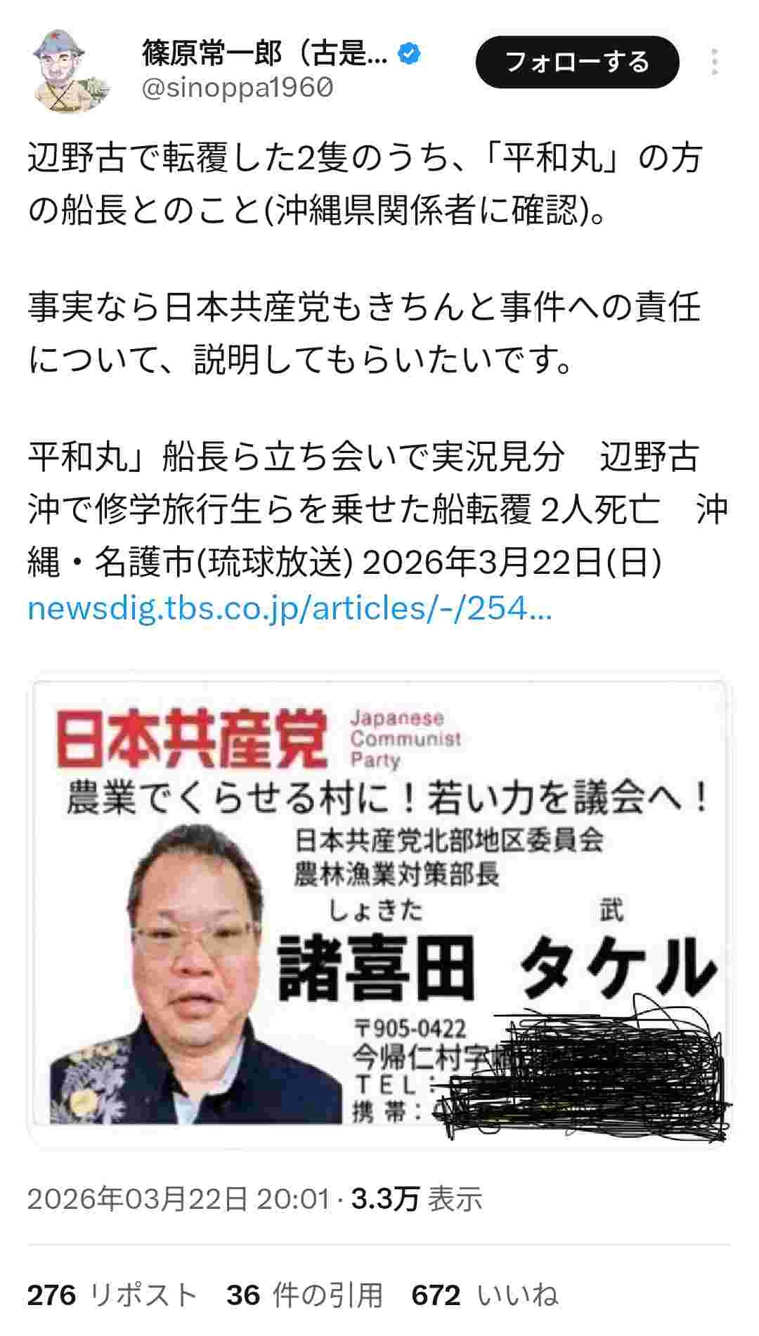 【終了】転覆した平和丸の船長、日本共産党の議員の模様