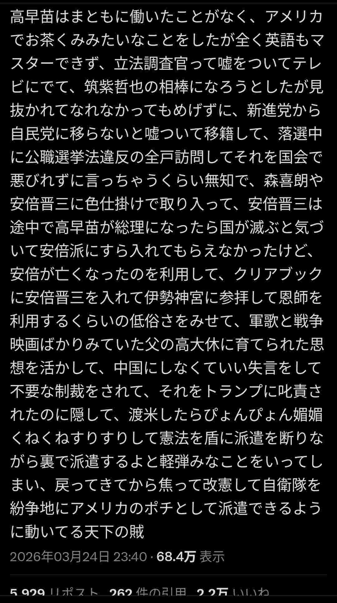 安倍晋三は途中で高早苗が総理になったら国が滅ぶと気づいて安倍派にすら入れてもらえなかったけど、安倍が亡くなったのを利用して、クリアブックに安倍晋三を入れて伊勢神宮に参拝して恩師を利用するくらいの低俗さをみせて