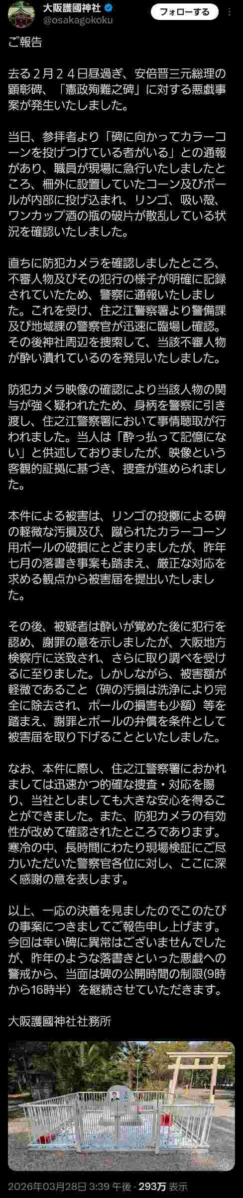 変な弱小の有象無象の新興宗教じゃないんだから、勝手に変なもん境内につくってええんかなああ?民間人かってに(元総理とはいえ、壺にマンセーしてたしなあこの人