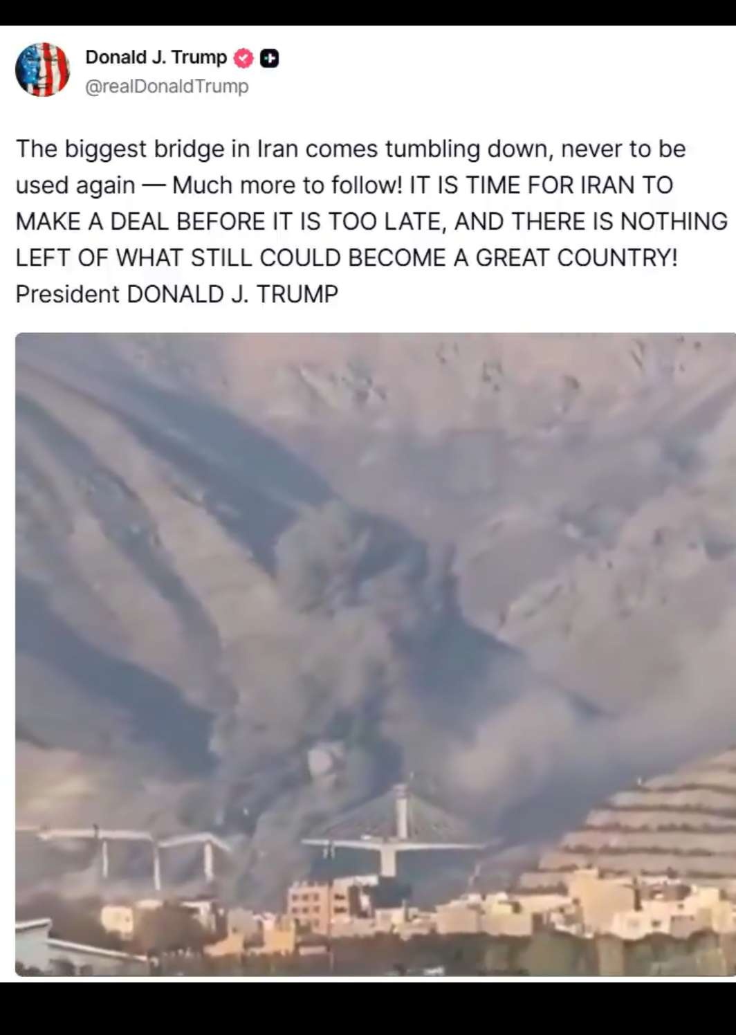 トランプ米大統領は、イランの橋への攻撃後の様子を映した動画をソーシャルメディアに投稿し、「これからもっと多くのことが起こるだろう」と明言。さらに、イランは「手遅れになる前に」合意すべきだと付け加えた。