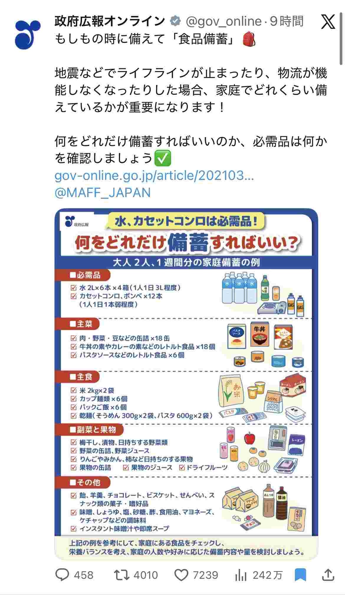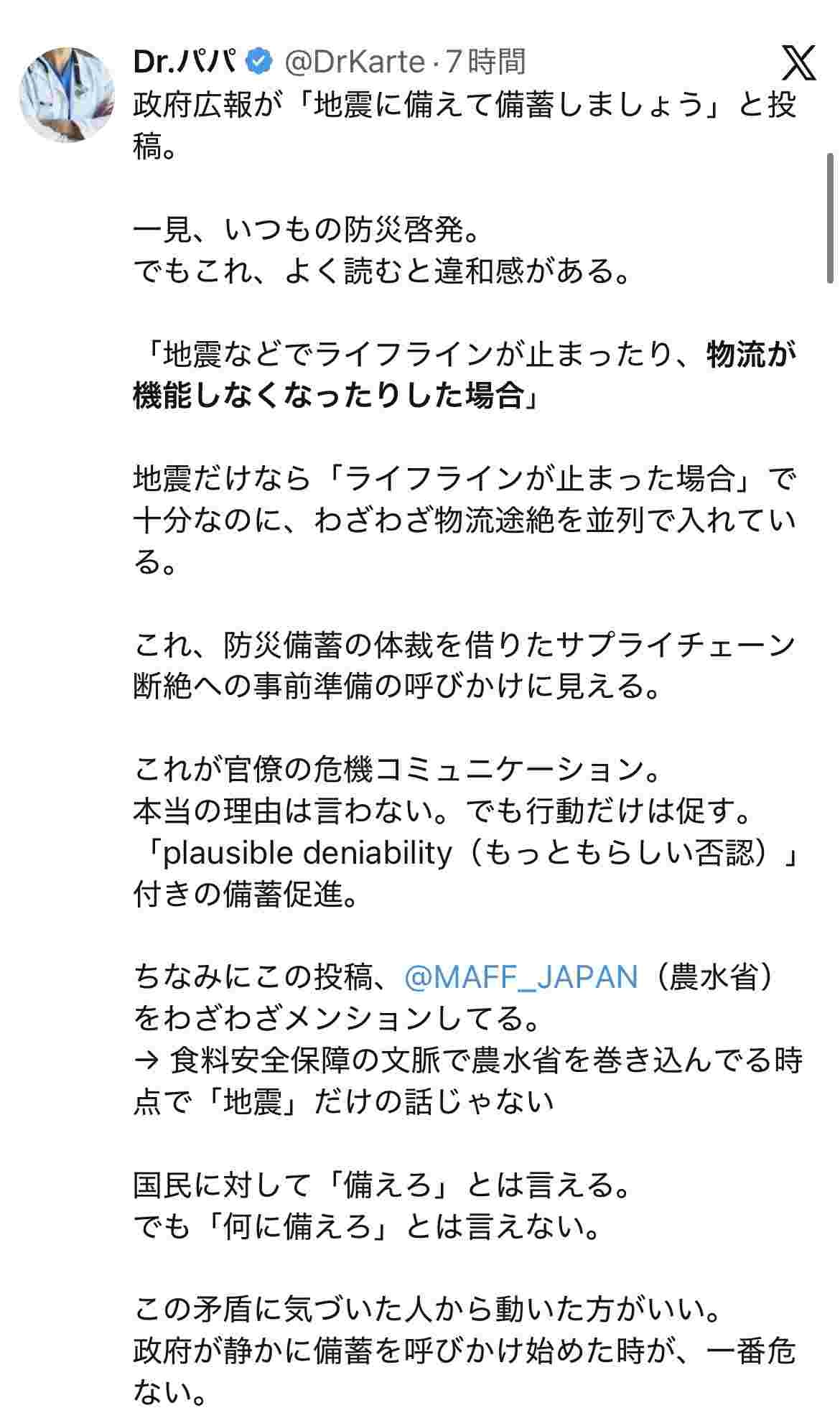備蓄って…戦中か何かか?今この瞬間にも日本人は高市総理圧倒的支持で身を委ねているのに急にナイアガラ直下くらい生活が変わりそうだな?