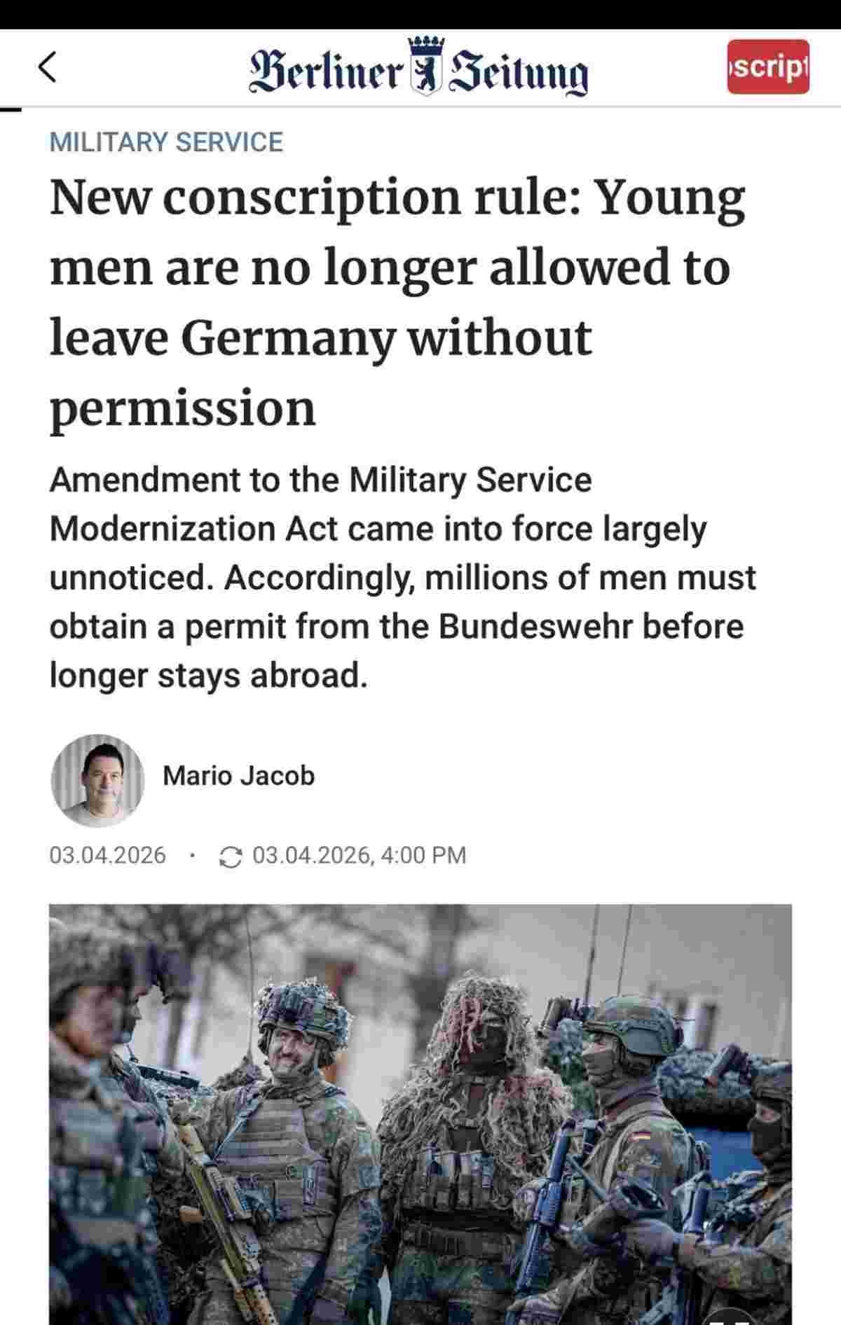 ドイツのWehrdienst-Modernisierungsgesetz(2026年1月1日施行)に基づき、17歳から45歳の男性は、学業・就労・旅行を問わず、3か月を超える海外滞在について、連邦軍のキャリアセンターの承認を取得しなければなりません。これは、緊張や防衛緊急事態の時だけでなく、平時にも永続的に適用されます。更新されたWehrpflichtgesetz(§ 3 Abs. 2)およびBerliner ZeitungとFrankfurter Rundschauの報道により確認されています。この規則は、新しい自発的な兵役制度の下で、潜在的な予備役員の追跡に役立ちます。