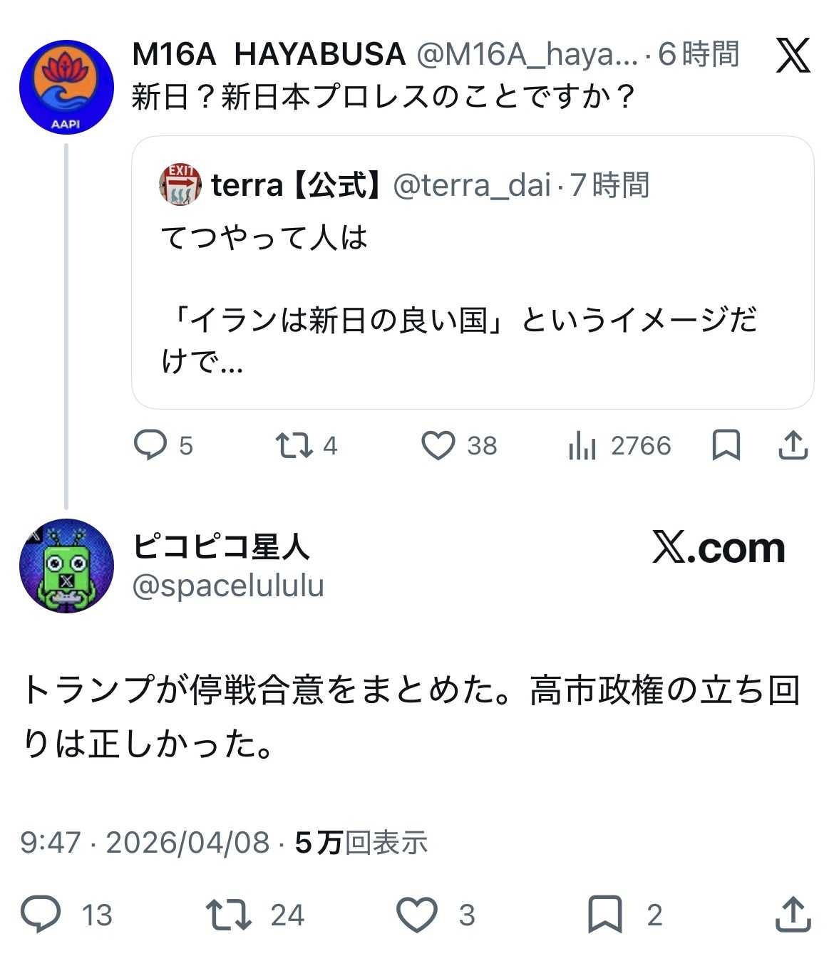 日本人「トランプが停戦合意をまとめた。高市政権の立ち回り正しかった」