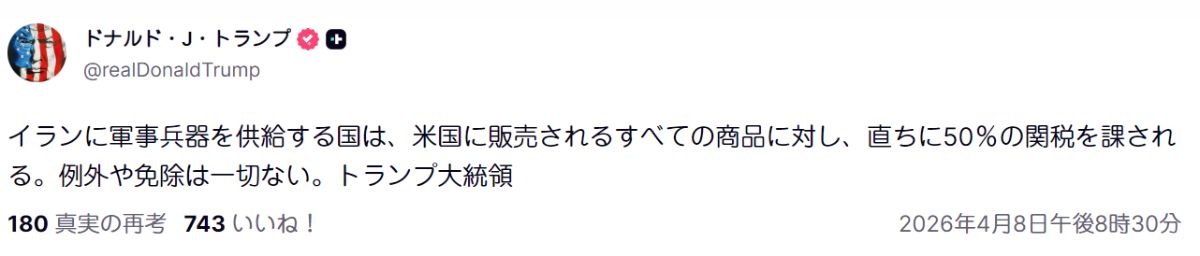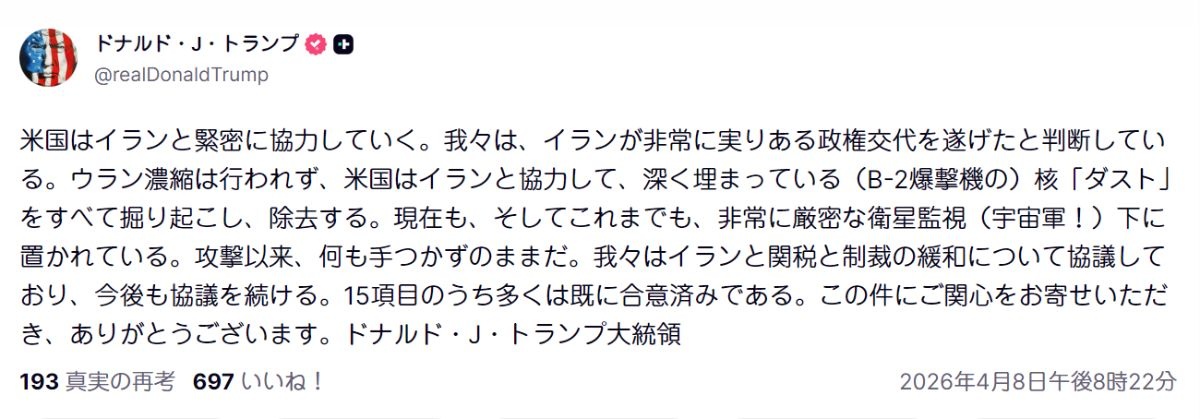 米国は、極めて実り多い政権交代を遂げたとの判断に至ったイランと緊密に協力していく。ウラン濃縮は行われない。また、米国はイランと協力し、深く埋められた(B-2爆撃機による)核の「塵」をすべて掘り起こし、除去する。同地域は現在、そして以前から、極めて厳格な衛星監視(宇宙軍!)の下にある。攻撃の日以来、何も手つかずのままである。我々は現在、イランと関税および制裁の緩和について協議しており、今後も協議を続ける。15項目のうち、すでに多くの点で合意が得られている。本件に関心を寄せていただき、感謝する。ドナルド・J・トランプ大統領