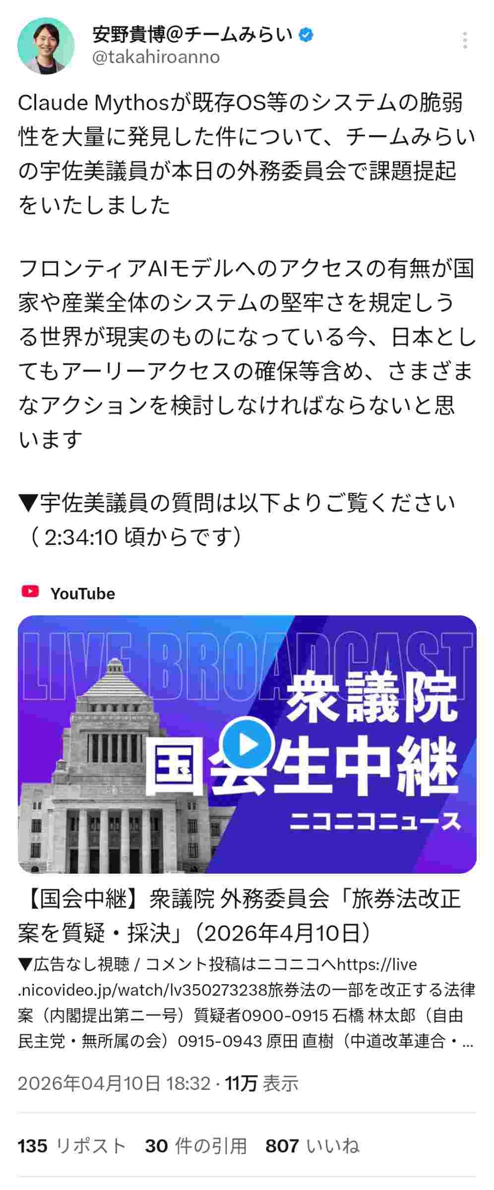 チームみらい、クロードが既存OSの脆弱性を大量発見した件を国会質問「フロンティアAIモデルへのアクセス性は国家的な問題」