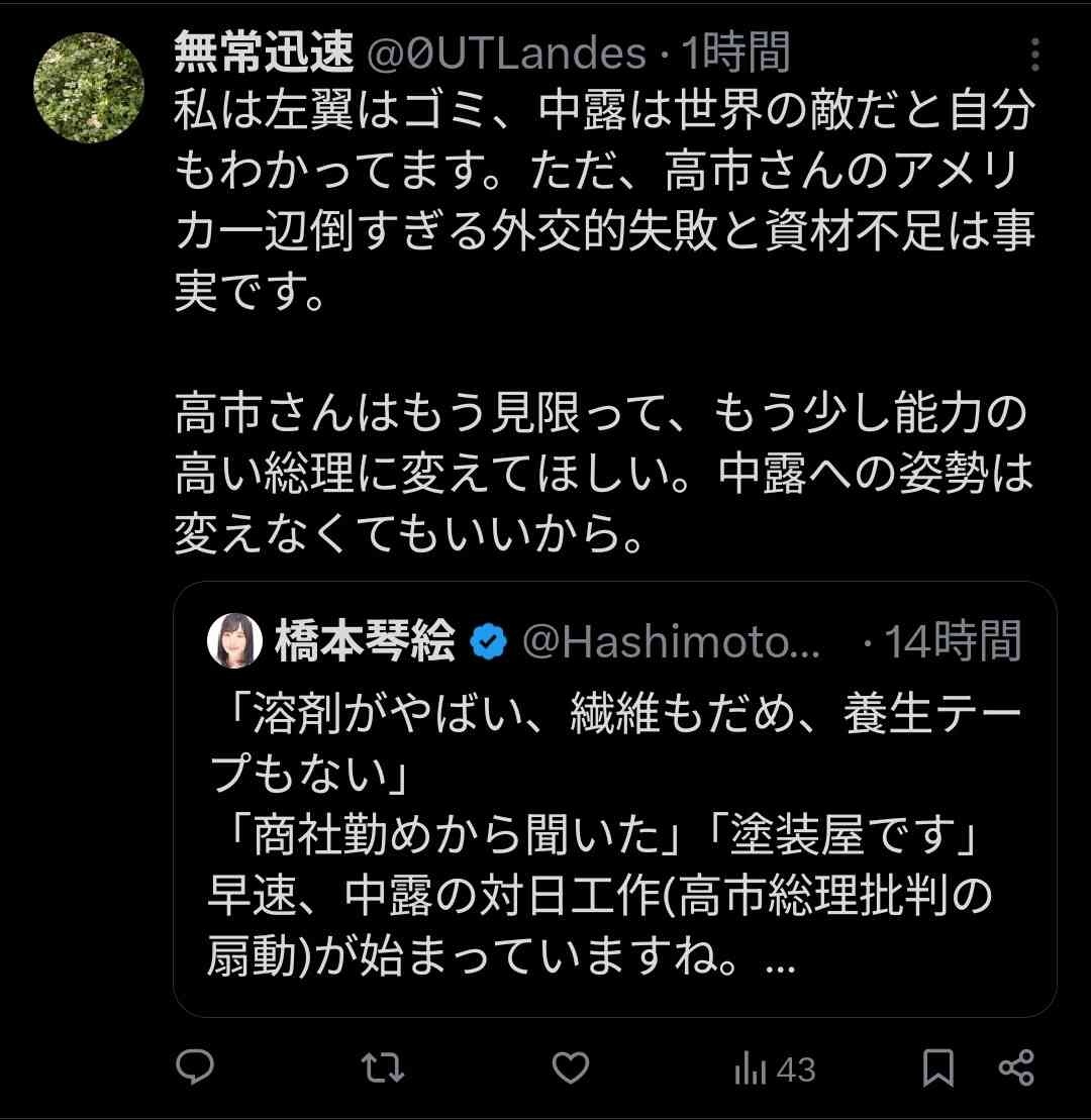 【悲報】橋本琴絵愛国烈士「溶剤がない、商社から聞いた、これ中露の高市批判扇動対日工作です!」現場の人間から総フルボッコされる [126042664]