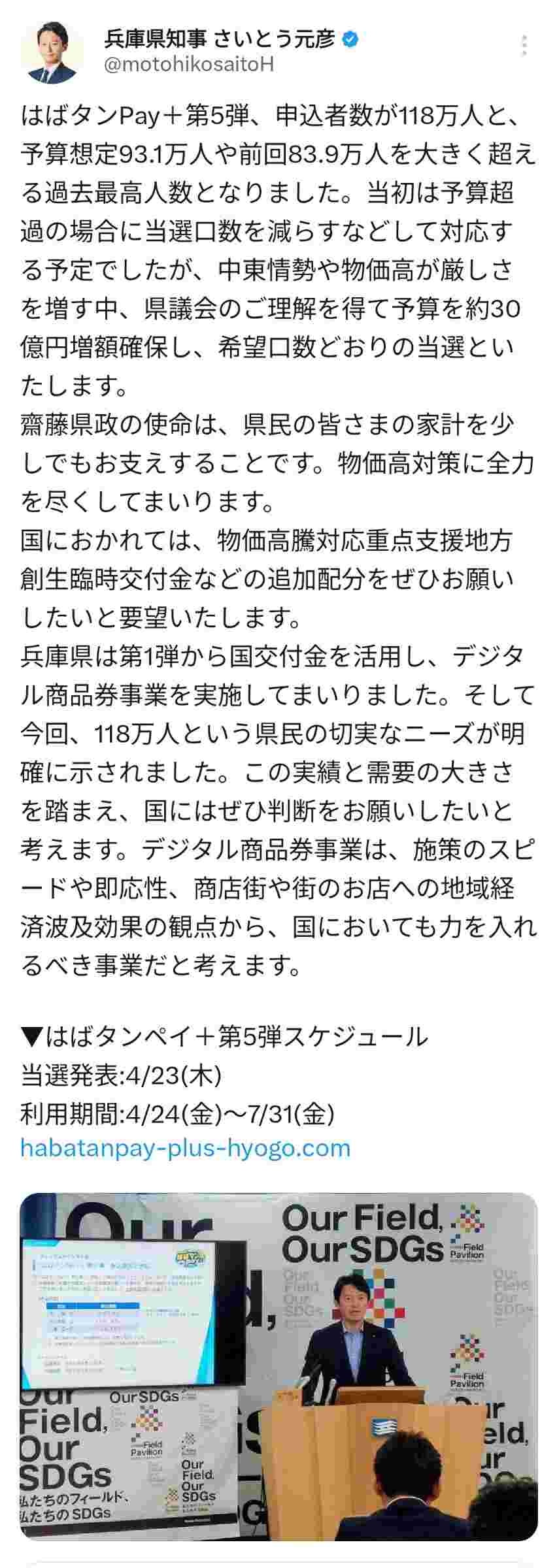 ちなみにこれ、県税ではなく国の交付金が原資だから、斎藤はん何も関係ない