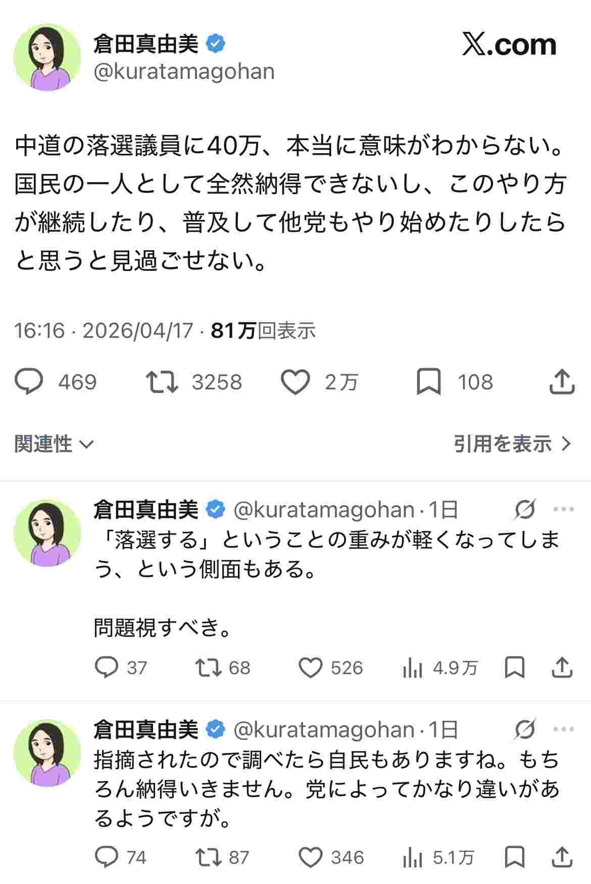 中道改革連合「月額約40万円」衆院選落選者に支援を発表、“税金投入”の正当性に向けられる冷ややかな視線(週刊女性PRIME) - Yahoo!ニュース“選ばれざる者たち”への方針が、物議を醸している。4月14日、中道改革連合は今年1月から2月にかけて行われた衆院選の落選者に対する“支援制度”を、5月から開始すると発表した。news.yahoo.co.jp