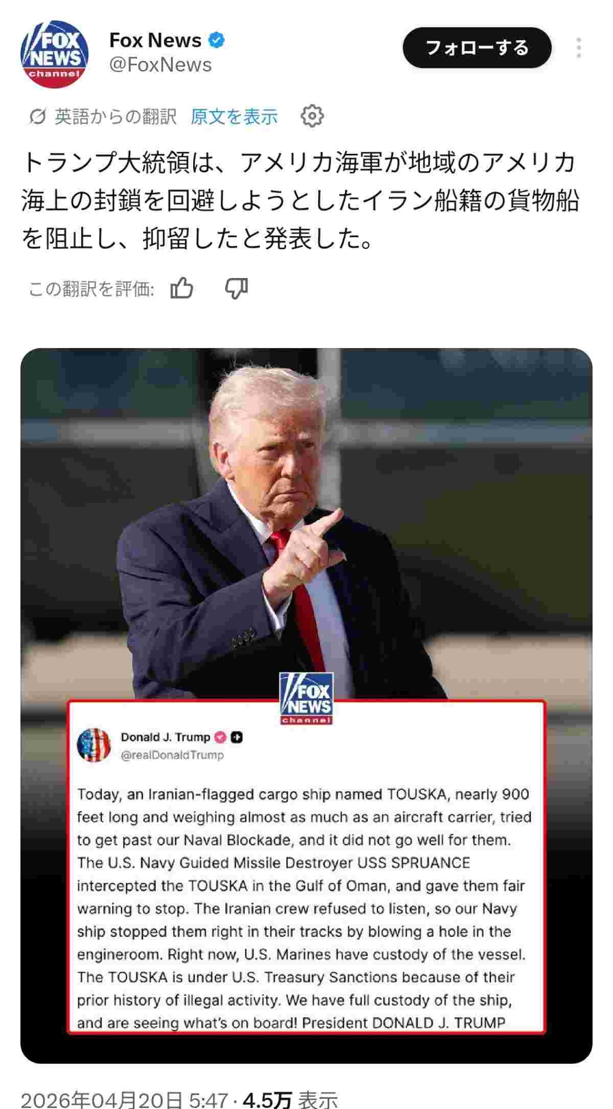 「米海軍のミサイル駆逐艦USSスプルーアンスはオマーン湾でTOUSKAを阻止し、停止するよう警告した。イラン人乗組員は警告に従わなかったため、米海軍艦艇は機関室に穴を開けて彼らを停止させた」とトランプ大統領はTruth Socialに投稿した。