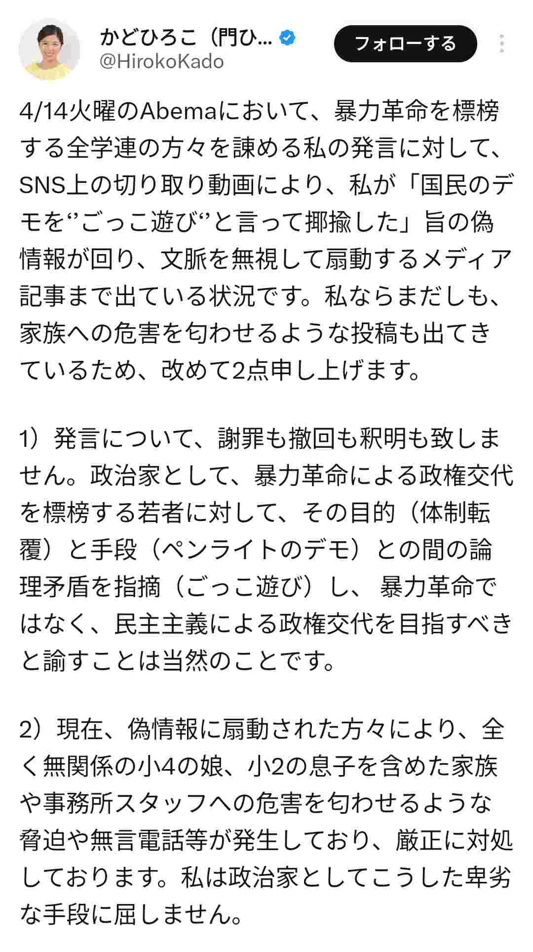 4/14火曜のAbemaにおいて、暴力革命を標榜する全学連の方々を諌める私の発言に対して、SNS上の切り取り動画により、私が「国民のデモを‘’ごっこ遊び‘’と言って揶揄した」旨の偽情報が回り、文脈を無視して扇動するメディア記事まで出ている状況です。私ならまだしも、家族への危害を匂わせるような投稿も出てきているため、改めて2点申し上げます。