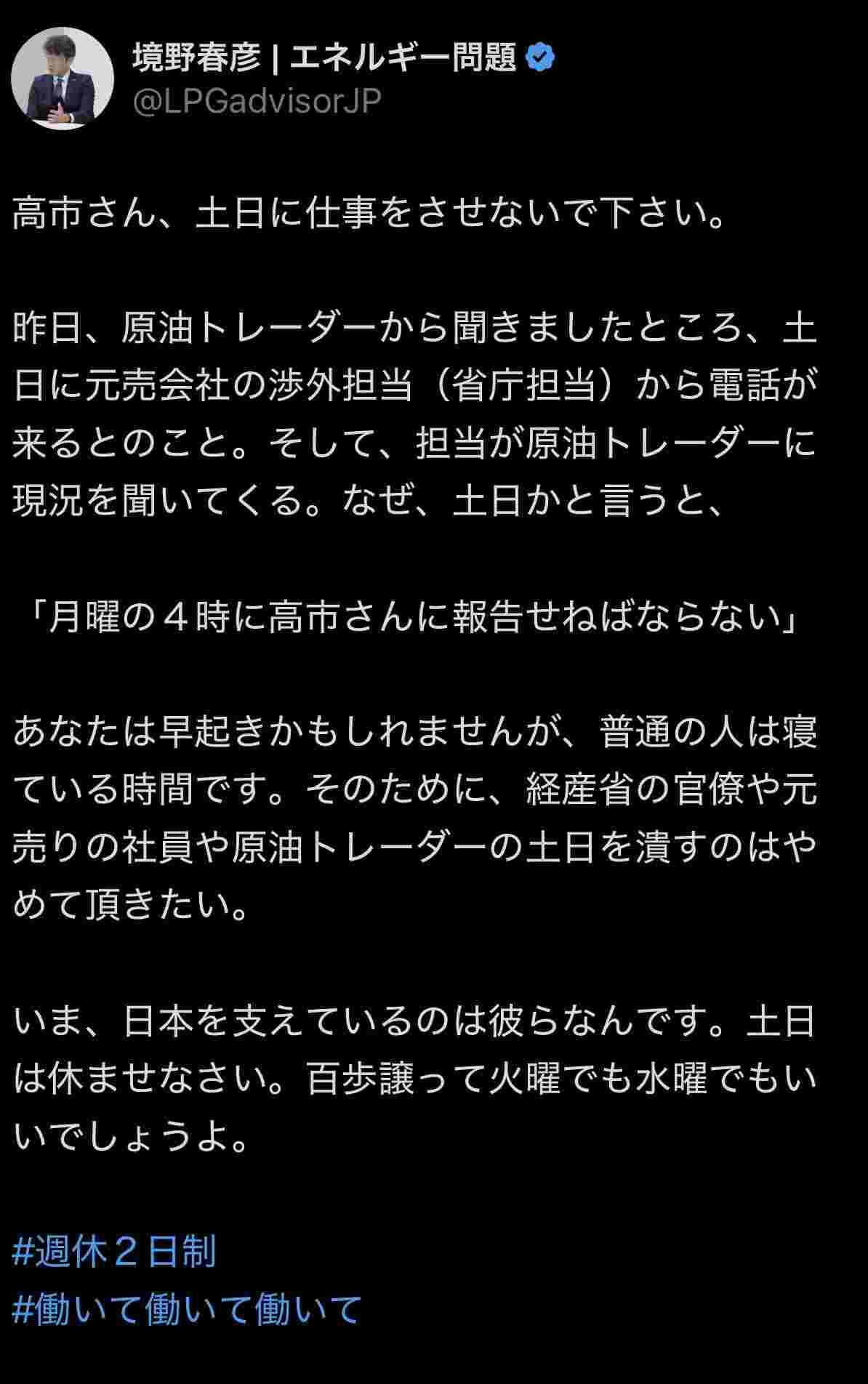 昨日、原油トレーダーから聞きましたところ、土日に元売会社の渉外担当(省庁担当)から電話が来るとのこと。そして、担当が原油トレーダーに現況を聞いてくる。なぜ、土日かと言うと、