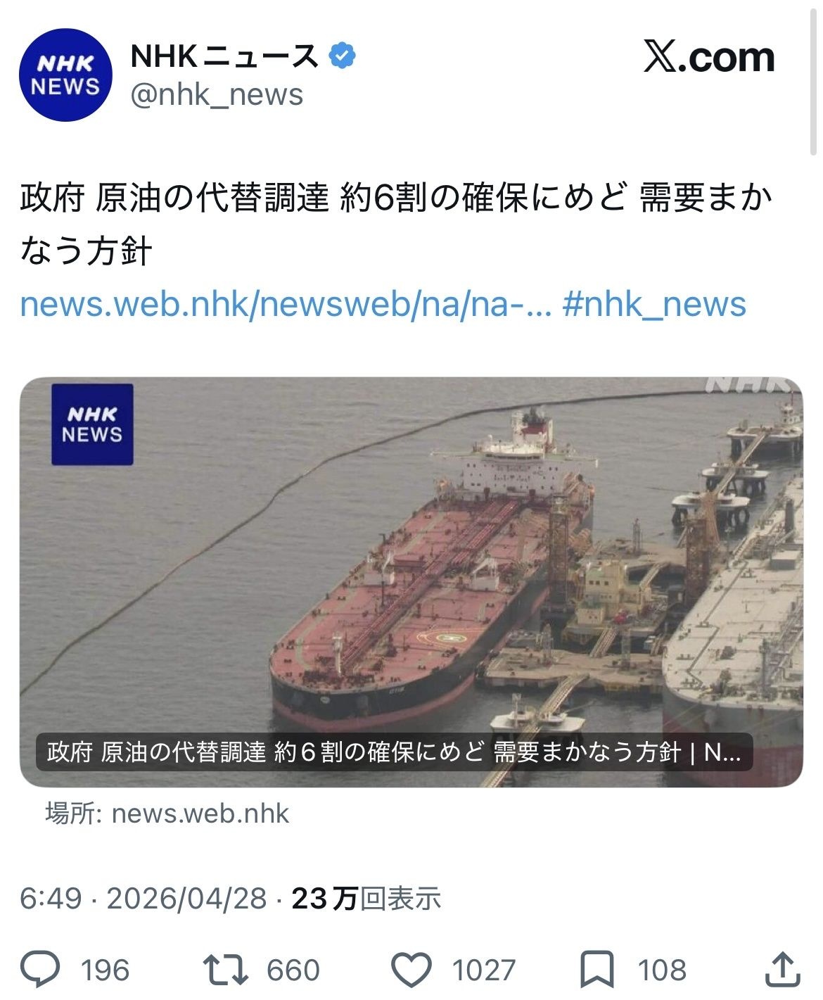 せめてどこから何バレルという具体性を伴った情報ならなー