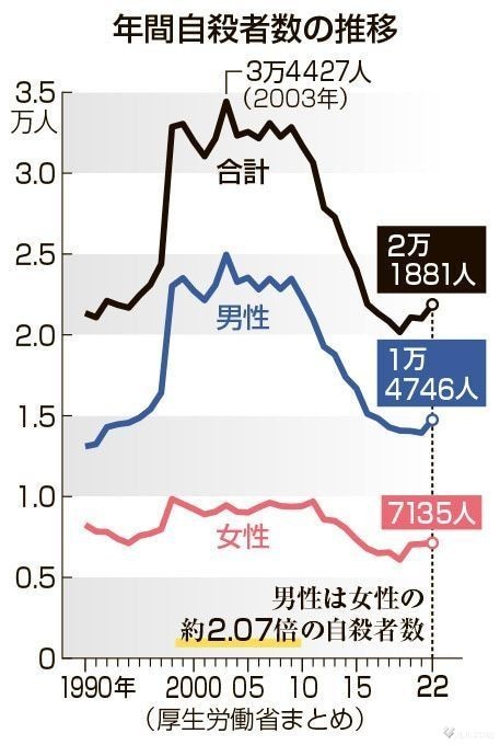 「日本の男性は女性の2倍も自殺している。女性よりもずっと、男性の方が生きづらい」ー。SNS上で、こんな意見を目にしたことがある。統計上は確かにその通り。だが、日本は本当に、男性の方が生きづらい社会なのだろうか。自死をめぐる男女差は、いったいどこから生じるのか。(時事ドットコム編集部 太田宇律)