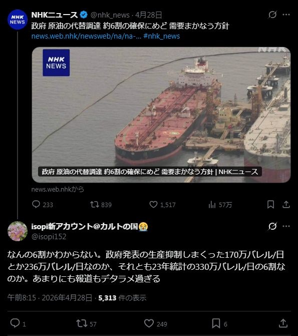 だから、日本の実際の石油調達量は意外に多い可能性はあるだろ。