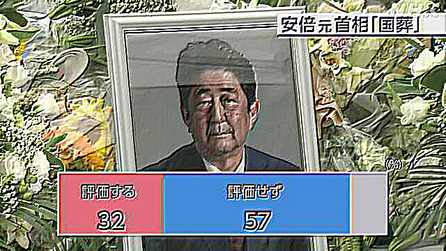 政府が、今月27日に安倍元総理大臣の「国葬」を行うことへの評価を聞いたところ、「評価する」が32%、「評価しない」が57%でした。 - 26 : 2022/09/28(水) 13:00:53.99 ID:0fCLihOi0