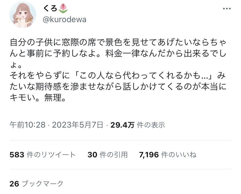 俺は何ヶ月も前にわざわざ窓際を予約した席だから断るなと思いながら見てた - 71 : 2023/05/08(月) 01:32:57.29 ID:aMqO5AIr0