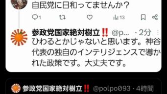 嫌儲 【さや悲報】参政党支持者、自民党に日和ってませんか?の問いに「ひわるとかじゃないです😤」とポスト