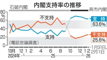 嫌儲 【世論】高市を支持63.6%(+0.5%)、自民36.1%(+6.9%)、中道13.9%(+2%)、国民5.7%、参政党5.6%、維新5.4%、みらい4.4%。