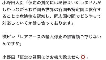 なんG 記者「レアアースが輸入停止になった時の対応策はあるのか?」小野田紀美「仮定の質問には答えません」
