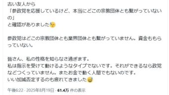 嫌儲 参政党神谷「参政党はどこの宗教団体とも業界団体とも繋がっていない、私はお金で動く人間ではないです」