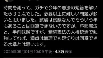 嫌儲 憲法学者「今年の司法試験の憲法の問題を解いてみた」→50点満点中32点(557位相当)