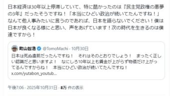 嫌儲 ゆたんぼ気づく「日本経済は30年以上停滞していて、特に酷かったのは民主党政権の悪夢の3年だったそうですね!