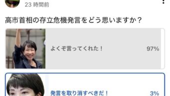 嫌儲 高市首相の存立危機発言、「よく言ってくれた」97%「発言を取り消すべきだ」3%